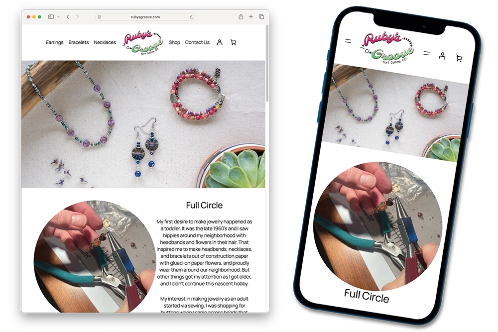 Ruby’s Groove’s branding package included a website design with a custom hero image I arranged and photographed. The hero image included a necklace, bracelet, and earrings, designed by her. Because her jewelry often include natural stones or gems, we felt it necessary to include other natural items, such as a wood branch and succulent plant.
